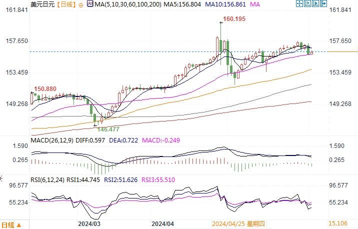 周一(6月3日),美元指数早些时候跌至104.13,为5月中来最低点。美元兑日元也跌至两周低点,纽约尾盘下跌0.7%,报156.22。周一的数据显示,美国供应管理协会(ISM)5月份制造业采购经理人指数(PMI)从4月份的49.2降至48.7,3月份曾触及18个月高点50.3。BMO在一份研究报告中指出,美国制造业在过去19个月中有18个月出现萎缩。在周一公布ISM指数下滑之前,芝加哥采购经理人指数、达拉斯联储、费城联储和纽约州的制造业指数均表现疲软。由于非住宅活动减少,4月份美国建筑支出也意外连续第二个月下滑,继3月份下降0.2%之后又下降了0.1%。在ISM和建筑支出数据公布后,根据LSEG的利率概率应用程序,联邦基金利率期货将9月份降息的可能性提高到59.1%左右,而上周五晚些时候为55%左右,上周早些时候则略低于50%。近段美国疲软的经济数据,提升美联储年内晚些时候降息的预期,令日元的贬值压力有所舒缓。日线图上,美元/日元隔夜一根大阴柱将汇价拖低至布林带中轨线之下,技术指标有勾头转下顷之势。须得提防美元/日元久攻不上转而招致逢高抛售盘打压产生下行的风险。整体来说美元/日元仍未摆脱区间震荡的走势,震荡区间主要集中在153-158之间。