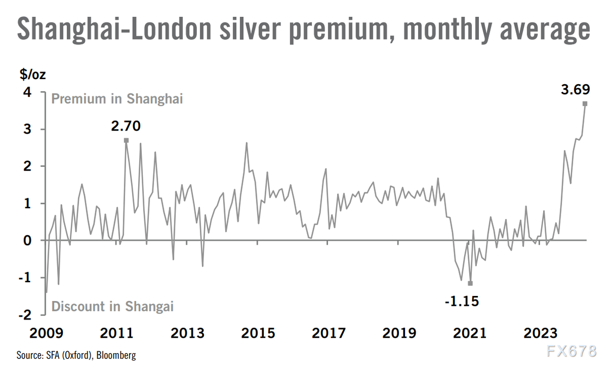 Heraeus表示,“来自强劲的太阳能光伏生产的需求——目前有望超过去年的纪录——将维持中国对白银的高进口需求。这一趋势反映在中国白银市场的高溢价上。今年4月,上海和伦敦白银现货价格之间的月度价差达到了3.69美元/盎司的历史最高水平。套利行为的增加还可能鼓励更多金属流入中国,并进一步收紧其他地区的供应。”