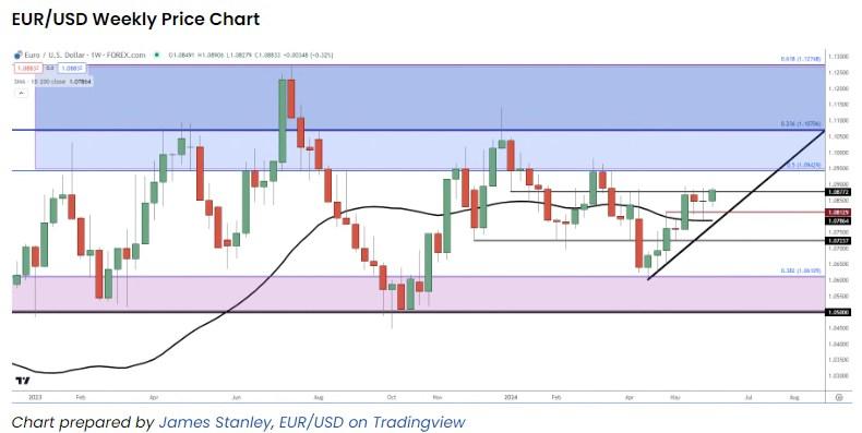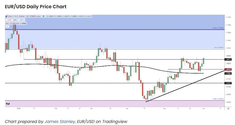 从下面的日线图中,我们可以看到更高的高点和低点的延续,上周在重新测试200日移动均线之前显示了看涨防御。这使得多头能够控制趋势,下一个重要的阻力位是3月份出现的1.0943,这有助于在空头夺回之前守住高点。