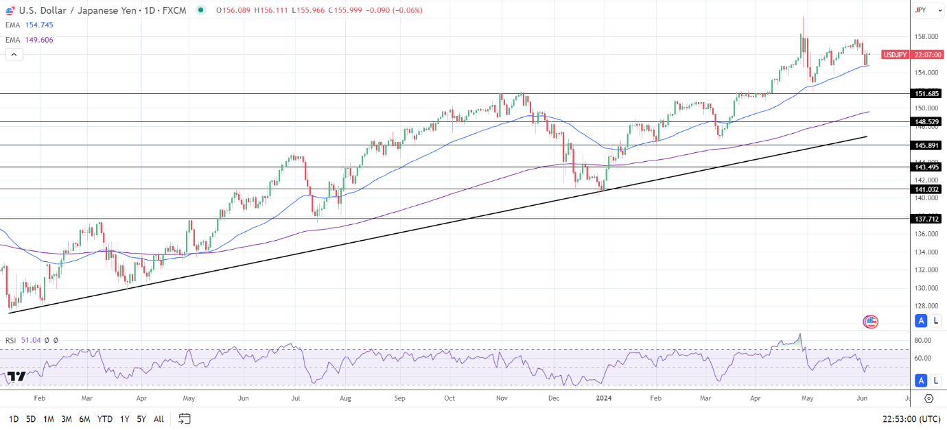 美元/日元突破156.500水平可能推动多头冲向158水平,此外,美元/日元重返158水平将支持其升至4月29日高点160.209。