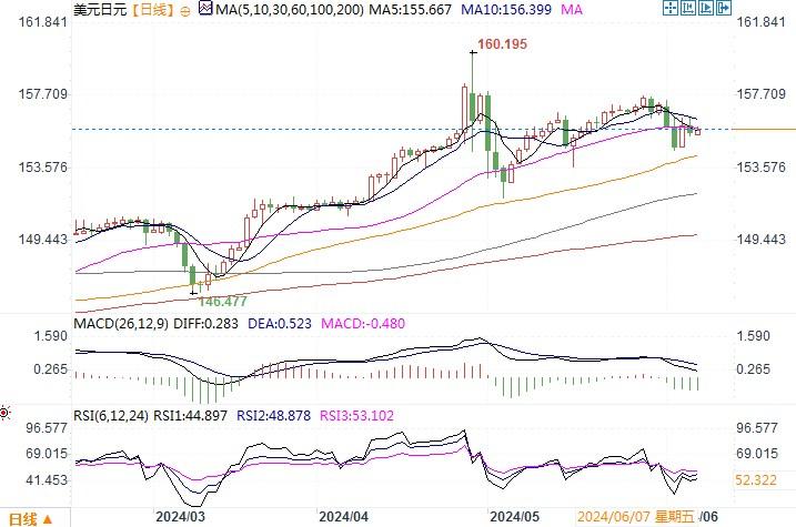 周四(6月6日),美元/日元下跌至155.65,投资者消化了日本央行总裁植田和男周四的讲话,即随着日本央行逐步退出大规模货币刺激政策,减少央行的债券购买将是合适的。日本央行将于下周召开为期两天的货币政策会议。Pepperstone研究主管Chris Weston说:“这几乎是日本央行带动的动能走势--即在日元和瑞郎等融资货币已经处于回补和回购的情况下,再加上日元的利好消息流出,助力日元的回升。”与此同时,加拿大和欧元区央行分别于本周三、周四相继降息25个基点,更是间接给到日元提振。目前,市场等待周五的美国就业数据,该数据可能有助于美联储制定宽松政策周期时间表,市场对于美联储也有望追随欧洲央行降息脚步的期盼热度在提升之中。日线图上,美元/日元经过周初的大跌后,在本周后半段交易日里走势呈区间震荡盘整走势,汇价整体仍受压于布林带中轨线之下,各项技术指标保持下顷,显示美元空头压力在增强。日内留意美国非农数据结果揭晓所带来的波动影响。