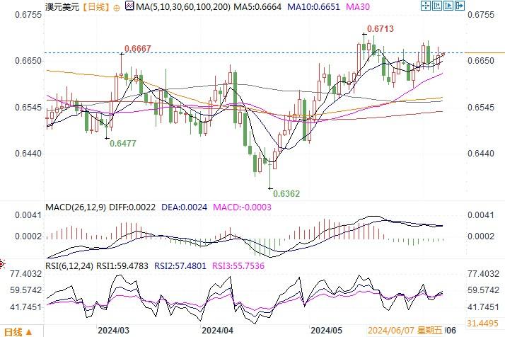 周四(6月6日),澳元/美元上涨0.5%,至0.6678。周四欧元区央行继周三加拿大央行降息之后也宣布降息25个基点,将基准利率降至3.35%。市场随之也提升了美联储将追随欧央行脚步降息的期盼。而澳洲央行则被认为在明年4月之前不太可能实施宽松政策。澳洲央行总裁周三重申利率前景是平衡的,但同时也强调,如果通胀比预期更加顽固,央行准备再次收紧利率。利率政策前景与其他国家不同,助力澳元/美元稳步回升之中。日线图上,澳元/美元处于布林带中轨线之上,整体震荡攀升之势未变,但上升动能不大,波动区间主要集中于0.6620-0.6680区域。周五将出炉的美国5月就业报告备受关注,是决定方向的关键,日内需加以密切留意。