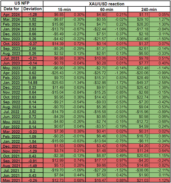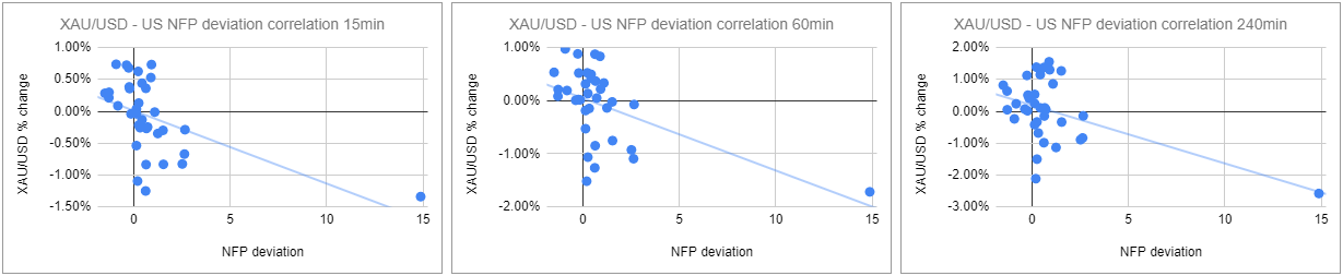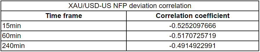 我们绘制了非农数据发布后的15分钟、1小时和4小时内的黄金价格反应。然后,我们将黄金价格的反应与实际非农结果与预期结果之间的偏差进行比较。