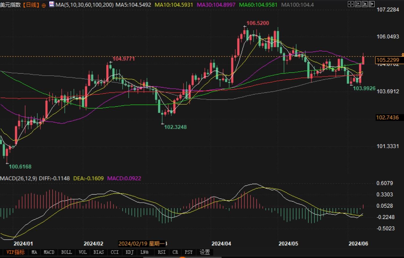 北京时间6月10日20:47,美元指数报105.25