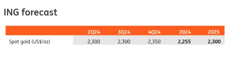 她总结道:“我们预计第二季度金价平均为每盎司2,300美元,2024年年均价格为每盎司2,255美元。”“我们预计第四季度金价将达到峰值,平均为每盎司2,350美元,前提是美联储在下半年开始降息,美元和收益率走弱。”