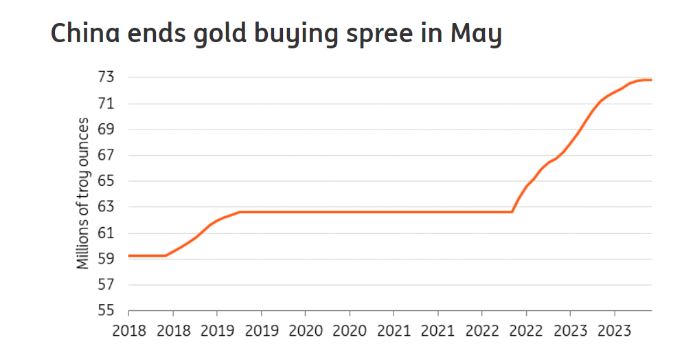 中国还在5月份停止了主权黄金购买,结束了18个月的净购买,其储备保持不变。她指出:“这是中国央行自2022年10月以来首次没有增加储备。”“这让黄金更容易受到下行压力。”