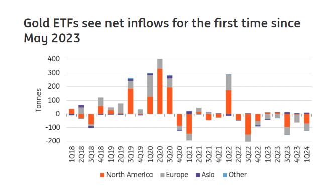 她指出,上个月一些地区的投资需求确实有所回升,推动全球黄金ETF12个月来首次实现净流入。“本月,欧洲和亚洲引领全球流入,而北美和其他地区则出现轻微亏损,”她说。“截至月底,全球黄金ETF持有量上升至3,088吨。”