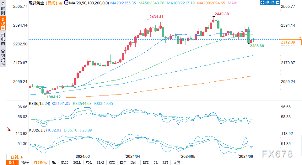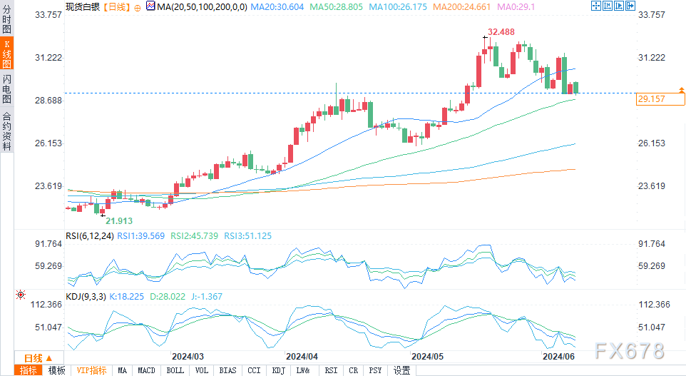 周二(6月11日)纽约时段,黄金和白银价格在周二美国午盘交易中走低,白银价格大幅下跌。这两种金属都受到近期美元指数强劲上扬和美国国债收益率上升的利空影响。在今天上午开始的联邦公开市场委员会会议结束之前,今天和周三大部分时间的交易可能会更加低迷。现货黄金价格盘中下跌2.70美元,至每盎司2,324.30美元。现货银价盘中下跌0.624美元,报29.245美元。