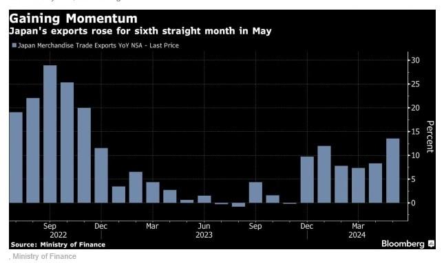 日本财务省周三(6月19日)公布,5月份出口同比增长13.5%,连续第六个月增长。这一增幅超过了经济学家普遍预期的12.7%,是自2022年11月以来的最大增幅。