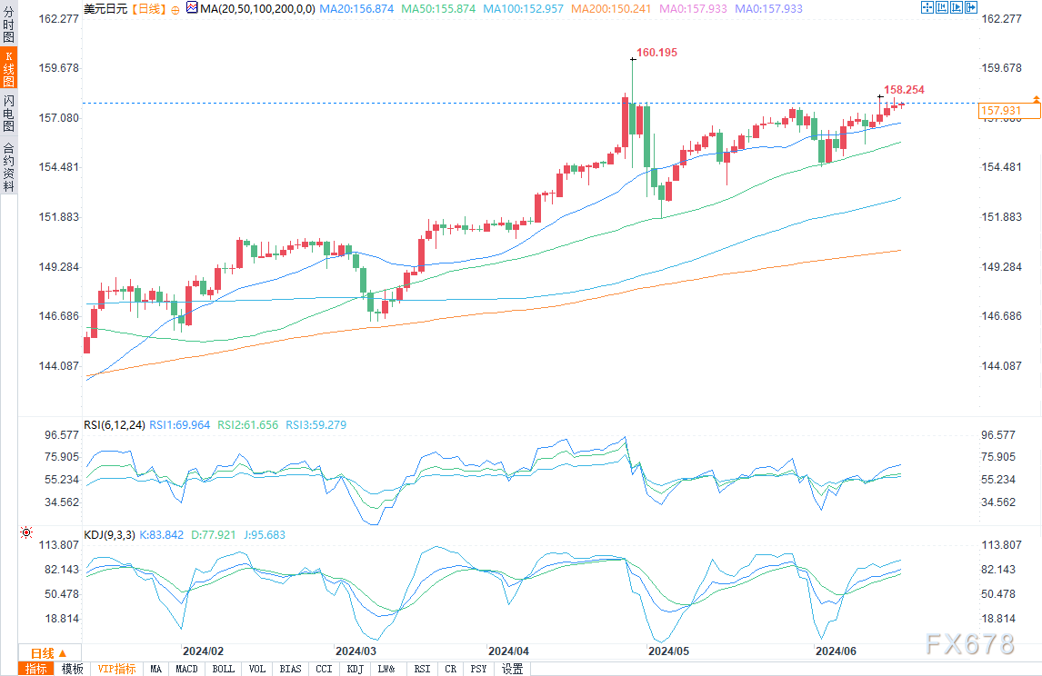 周三(6月19日)纽市盘中,美元/日元在欧市盘中下探至157.599的低点后v形反转,盘中报157.930,涨幅0.06%。