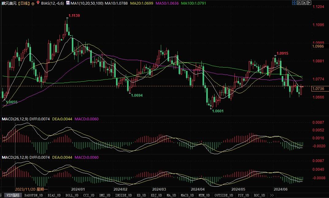 北京时间6月25日11:00,欧元兑美元报1.0736/37
