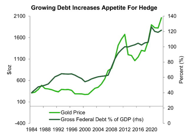 如下图所示,债务的不断累积增加和黄金的对冲需求