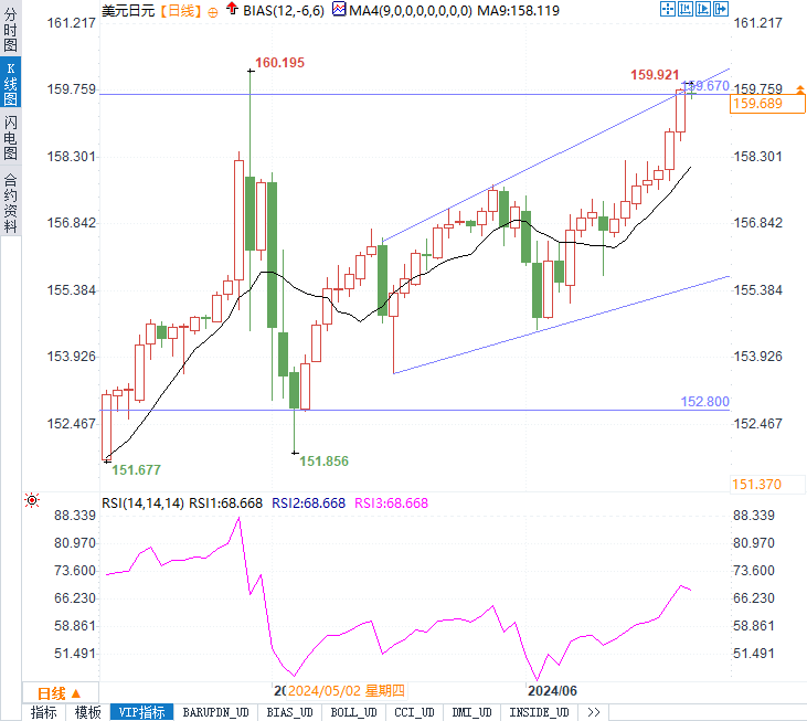 截至北京时间14:45,美元兑日元下跌0.08%,报159.688/86。