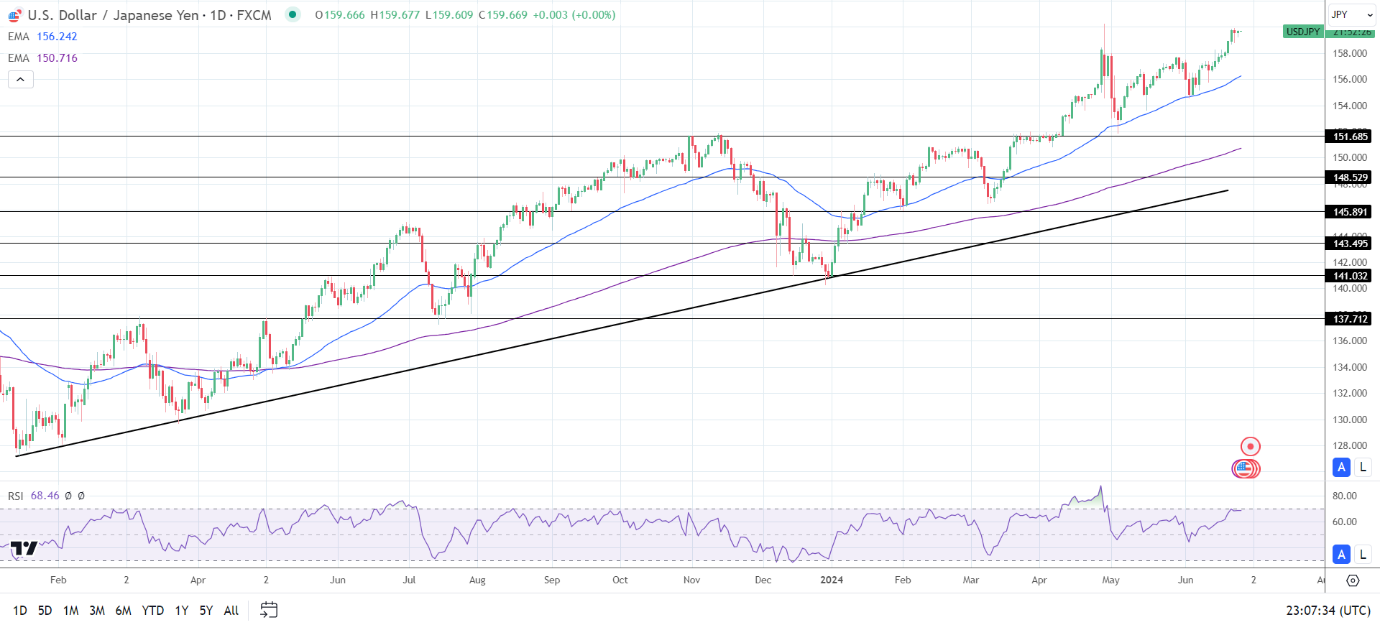 14天RSI为68.46,表明美元/日元将走势至4月29日高点160.209,然后进入超买区域。