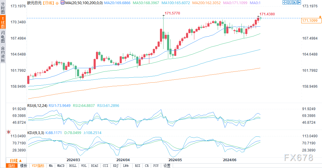 日线图上,类似于美元/日元,没有多少近期或历史价格数据高于170.00。因此,从技术上看,欧元/日元是否会继续走高可能会具有挑战性。