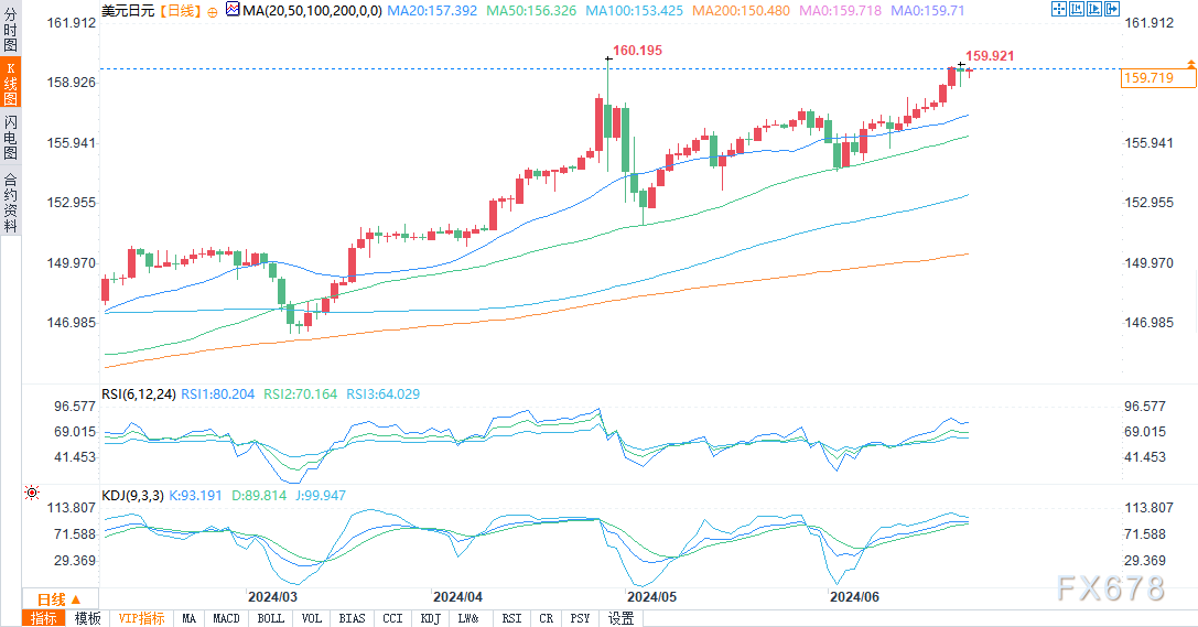 周二(6月25日)纽约时段,美元/日元保持稳定,交投于159.720附近,涨幅0.08%。以下是对美元/日元、欧元/日元、英镑/日元三组货币对的技术分析。