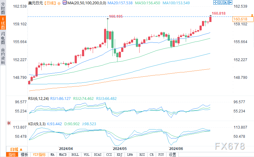周三(6月26日)纽约时段,美元/日元汇率盘中上涨至160.632,涨幅0.61%,突破了4月份导致政府干预市场的水平。欧元/日元汇率也涨至历史最高水平。今年以来,美元/日元汇率上涨了12%以上。