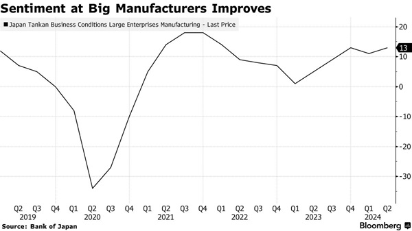 日本周一(7月1日)最新公布的关键数据显示,日本大型制造商的信心较三个月前上升,为日本央行考虑在本月晚些时候加息打开大门。