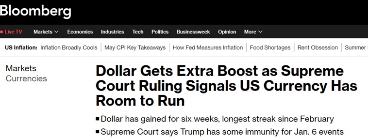 美国彭博社周二(7月2日)报道称,在美国最高法院(Supreme Court)做出一项关键裁决后,美元走强突显出,如果特朗普(Donald Trump)再次当选总统,美元可能进一步升值。