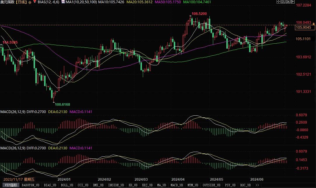 北京时间7月2日11:26,美元指数报105.91