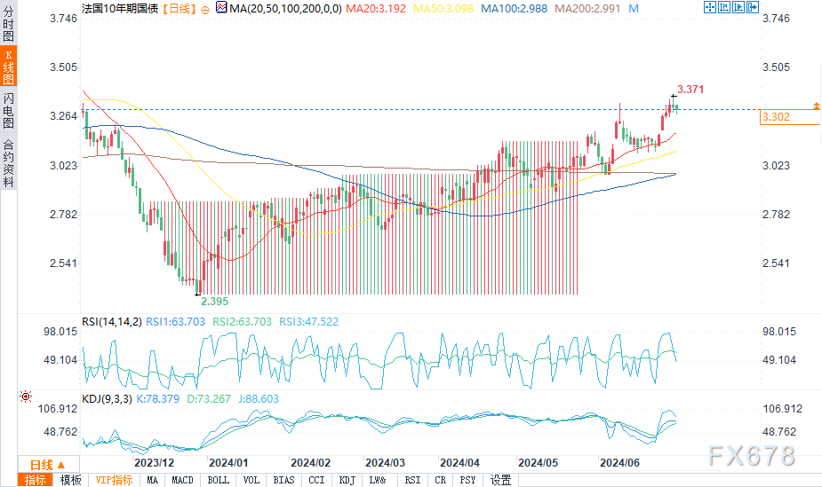 欧元交易员正在等待本周日法国第二轮选举的结果。国民联盟(RN)继续在民意调查中领先,但仍然不太可能获得绝对多数所需的289个席位。本周初,新共和党获得了280个席位,随着各种中间派和左翼政党联合起来阻止新共和党获得多数席位,这种情况似乎不太可能改变。这将导致一个非常不稳定的联盟,法国政府债券收益率将越来越高。