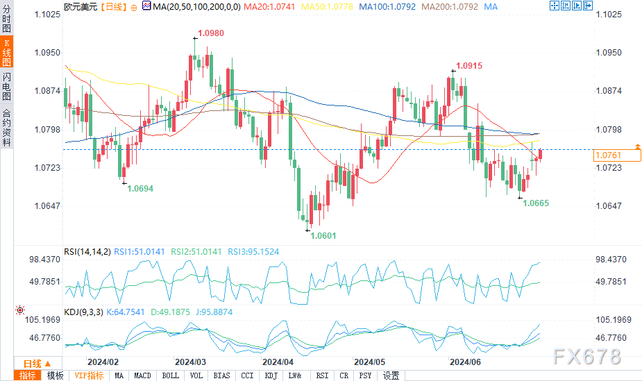 周三(7月3日)欧市盘中,欧元/美元在欧市早盘触及1.0735的低点后回升,盘中报1.0759,涨幅0.14%。