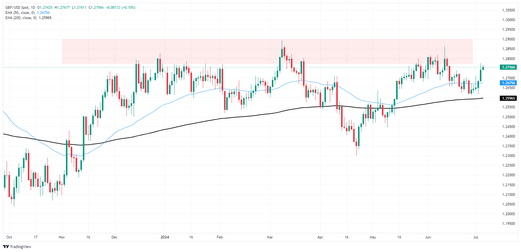 英镑/美元周五(7月5日)震荡上涨,目前交投于1.2763附近,逼近周三触及的近三周高点,涨幅约0.05%。根据全国出口民意调查显示,基尔·斯塔默爵士(Sir Keir Starmer)领导的工党将在英国大选中获得约170个席位的绝对多数,这表明里希·苏纳克(Rishi Sunak)领导的保守党将在执政14年后垮台。