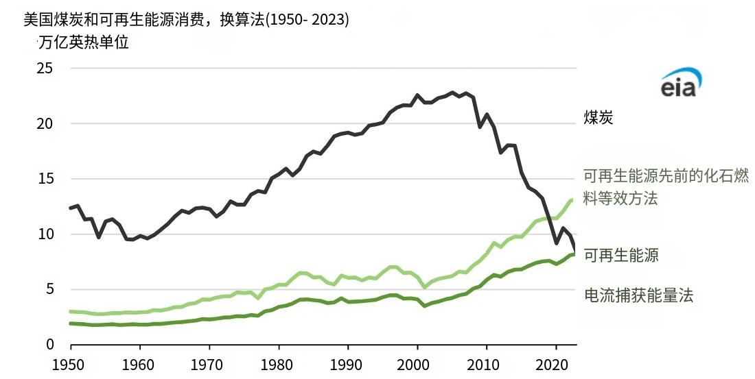 根据当前使用的捕获能源方法,美国的可再生能源消费量在2023年首次超过了煤炭消费量,这是自约1885年以来的首次。而根据之前的化石燃料等效方法,可再生能源消费量在2019年已经超过了煤炭。