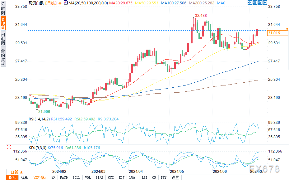 上周五,在美国公布非农就业数据后,银价飙升,该数据显示就业市场走软。这一数据增强了美联储 9月份降息的预期。具体而言,美国6月非农就业岗位增加20.6万个,超过经济学家预估的19万个。然而,5月和4月的就业增长预期被向下修正,5月的数据从27.2万调整为21.8万,4月的数据从16.5万调整为10.8万。此外,失业率上升至4.1%,略高于预期的4.0%。
