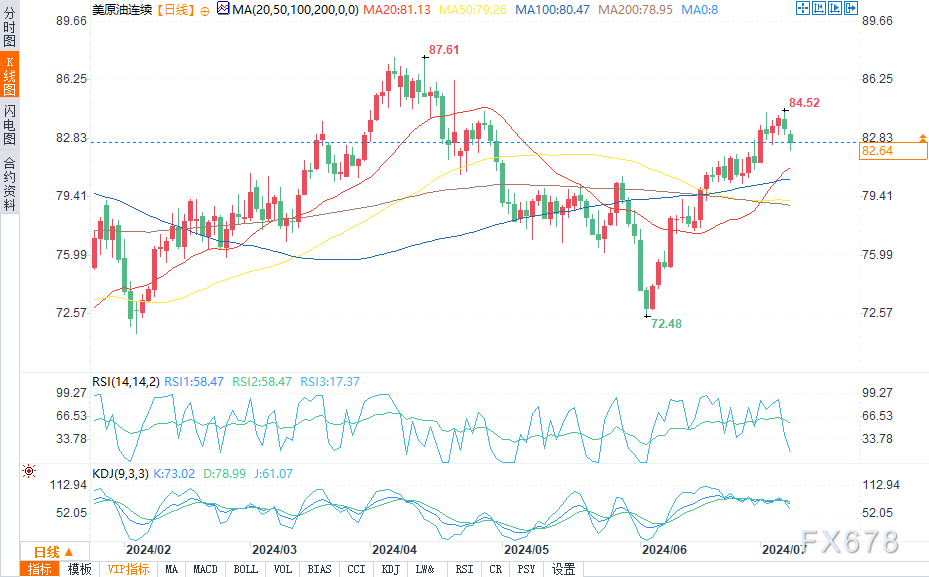 WTI原油期货图表显示近期从84.52美元阻力位回落。主要阻力位在86.24美元。
